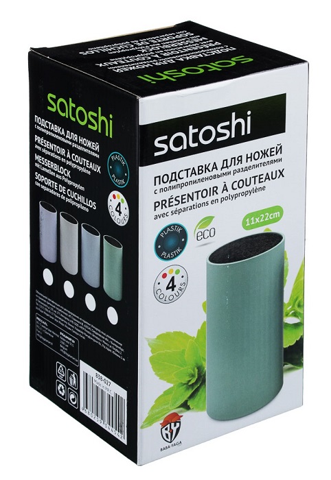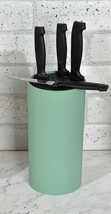 Подставка для ножей выполнена в прочном качественном пластике. Данный пластик ещё называют soft-touch благодаря его приятной и не скользящей фактуре. Специальная полипропиленовая вставка хорошо держит ножи в корпусе. Размеры: D=11 см.; H=22 см.